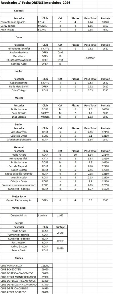 En Orense se desarrolló la primera de las citas del Grand Prix del Sudeste, una convocatoria que se desarrolló con una pesca discreta y con algunos pescadores que sobresalieron sobre el resto, como Arturo Prado, el exponente de Claromecó que fue la gran referencia y con 10 piezas fue el gran ganador de la fecha. Iñaki Hernández y Luciano Botta completaron el podio general, mientras que por clubes volvió a dominar Marea Roja por amplio margen. La pieza de mayor peso fue una corvina de 1.940 kg, captura de Adrián Dejean.
