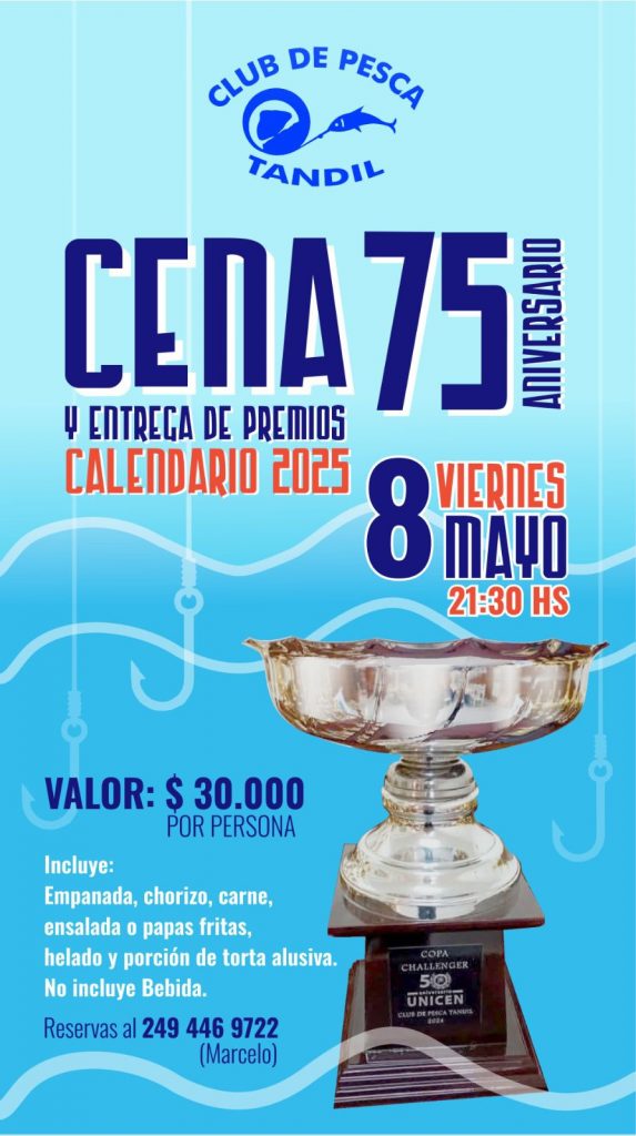 Desde la entidad anuncian para el viernes 8 de mayo a las 21.30 hs, la cena 75° aniversario del club. Será el momento propicio para la premiación del ejercicio 2025. Además, informan que se encuentra abierta la inscripción a la escuela de pesca para pescadores sin límite de edad, grupos mixtos que se encuentran en la sede de la entidad, San Lorenzo 818, los jueves 18.30 hs.